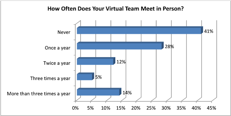 Une enquête indiquait en 2016 que les équipes de travail dans les entreprises multinationales étaient ainsi devenues presque entièrement virtuelles : 48 % des personnes interrogées indiquaient que plus de la moitié des membres de leur équipe étaient localisés dans d’autres pays (contre 33 % en 2012). 41 % des personnes faisant partie d’équipes internationales n’avaient jamais rencontré les autres membres de leur équipe physiquement. La crise du Covid-19, limitant drastiquement les déplacements à l’étranger, pourrait bien faire augmenter ce dernier chiffre à l’avenir.