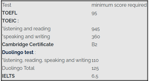 - Test Duolingo (total minimum 125 - "listening, reading, speaking and writing" (110 obligatoire)
